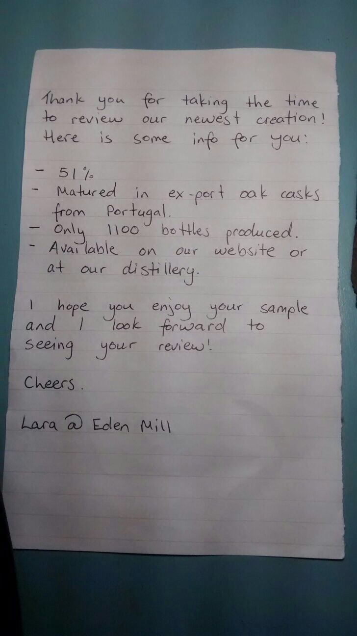Accompanied by a handwritten note from the team at Eden Mill (see below – tying in with their approach to handcrafting everything!), we discover that the whiskies within their Blend No. 4 have been married together and then matured in Portuguese ex-port European oak casks. The whisky is limited to 1,100 bottles and rocks in at 51% ABV so without further ado JB & me take on this new release…