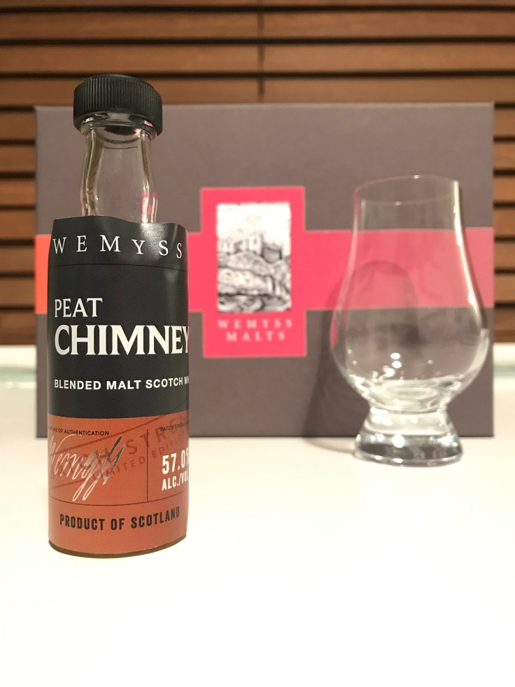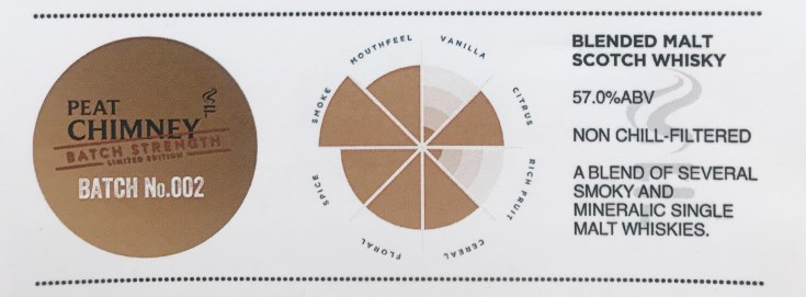In 2017, Wemyss Malts released the first limited edition batch releases of their 3 core range whiskies. The smokiest of these offerings is named the “Peat Chimney”, following the blended-maltsters’ pattern of two-word monikers for their whiskies. Following the success and sell out of the first batch, in early 2019 a second wave of the batch strength releases (note: not cask strength) has been unveiled with the self-explanatory title: Batch Strength – Batch 002. The blend of malts has been captured here at 57.0% ABV and is now available from Wemyss directly at RRP £48.95, and is limited to 9,000 bottles. The blend of peated malts have been married and finished in a Sherry Hogshead to provide some extra tannic spices and additional depth to the blend, though the exact malts that have gone into this blend remain their guarded secret.