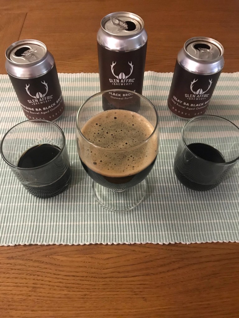 For this exercise then, given the winter climate, I’ve started with a comparison tasting (triple tipple) between their core range oatmeal porter Black Brose and its Speyside and Islay barrel-aged versions. It’s a tough job, but somebody’s got to do it! Well, in fact, I don’t have to do it, but like I said above, I’ve wanted to do it for some time, so, preamble over, here we go…