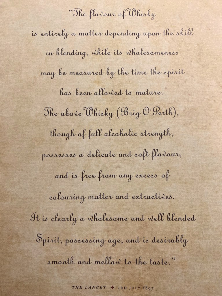 “The flavour of whisky is entirely a matter depending upon the skill in blending, while its wholesomeness may be measured by the time the spirit has been allowed to mature. The above whisky (Brig O’ Perth), though of full alcoholic strength, possesses a delicate and soft flavour, and is free from any excess of colouring matter and extractives. It is clearly a wholesome and well blended spirit, possessing age, and is desirably smooth and mellow to the taste”