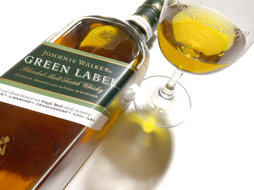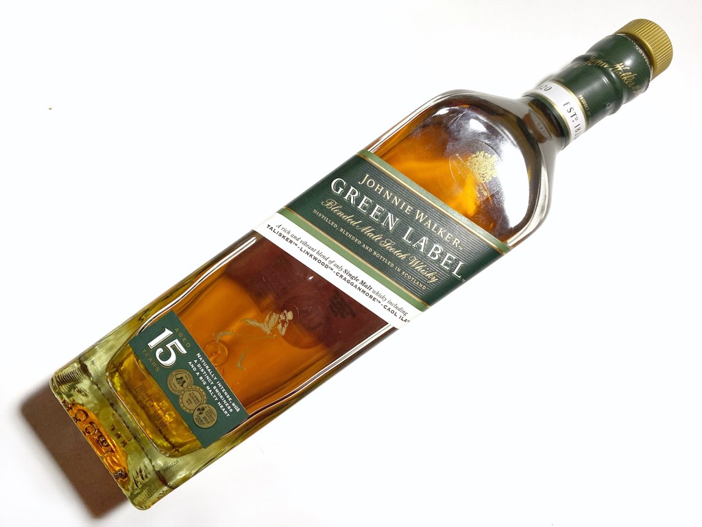 One relatively recent exception to this plan is their sole “Malts Blend”. First introduced in 1997 as Johnnie Walker Pure Malt, and then rebranded in 2004 simply as “Green Label”, this blended malt scotch whisky, features exclusively malt whiskies – no grain whisky appears here. Each constituent malt has been matured for a minimum of 15 years in European or American oak, and the Green Label recipe features malts from the “four corners of the Scotland”.