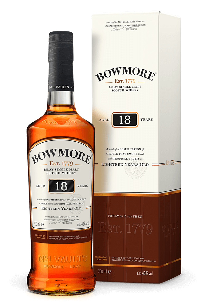 The 18 year old humbly describes itself as a “masterful combination of gentle peat smoke laced with tropical fruits” and it features 65% solely Bourbon Barrel matured Bowmore, with the remaining 35% having been matured in first fill Oloroso European Oak Butts for the sherry portion.
