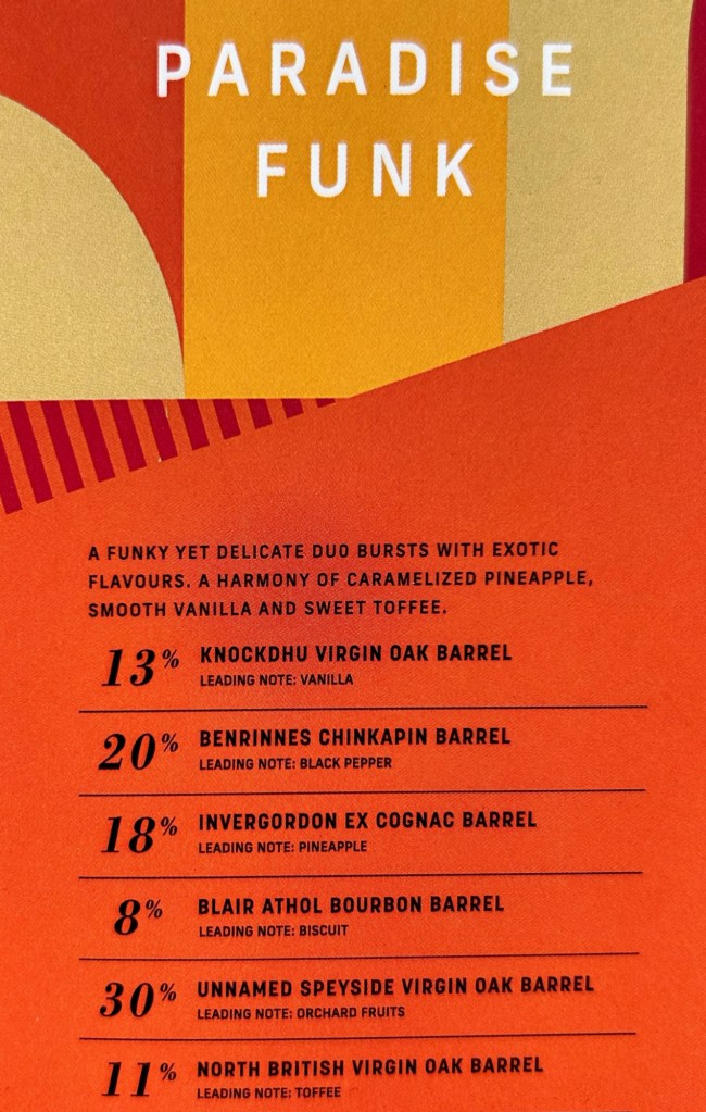 Maybe the name Funk has played on my mind but I did taste a slight whisky warehouse / dunnage style dank note. One that often goes with older whiskies and/or certain distilleries. Whichever of the 6 casks that have gone into this blend which is producing that note is bringing something that often gets overlooked in blended malts. Or could even get blended away. Personally, I’m all for that additional profile feature and, along with those stone fruit notes, think that this dram would go very well with a hazy NEIPA!
